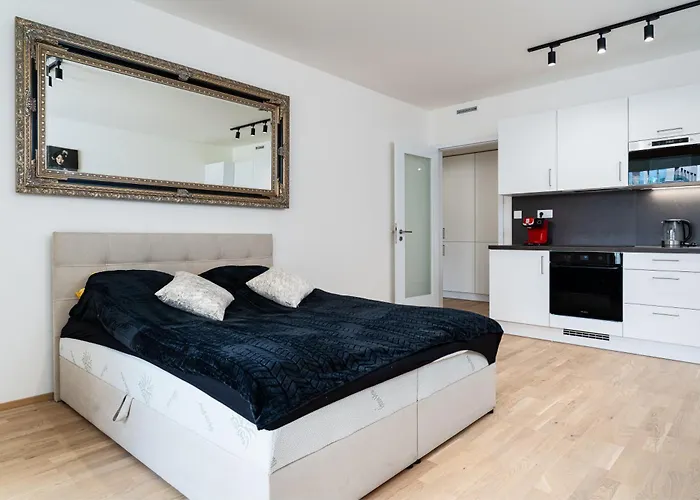 A Vysehradi kastély alig 1 km-re, míg a Lennon-fal alig 1,1 km-re van a 134 m^2-es apartman területétől. Az ingatlan Prága Prága II. e körzetében található. A Klementinum Nemzeti Könyvtár továbbá nem messze van a 2 hálószobás apartmantól.